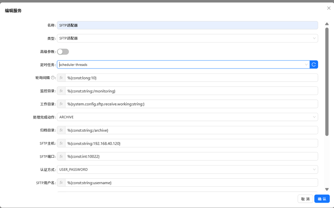 - 进入服务配置,创建SFTP适配器和配置属性: