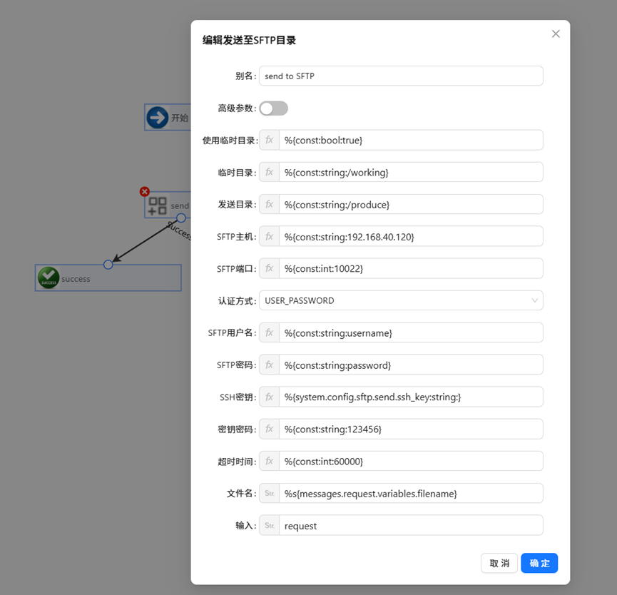 进入send to SFTP流程,打开发送到SFTP算子,编辑相关属性: