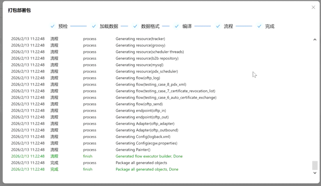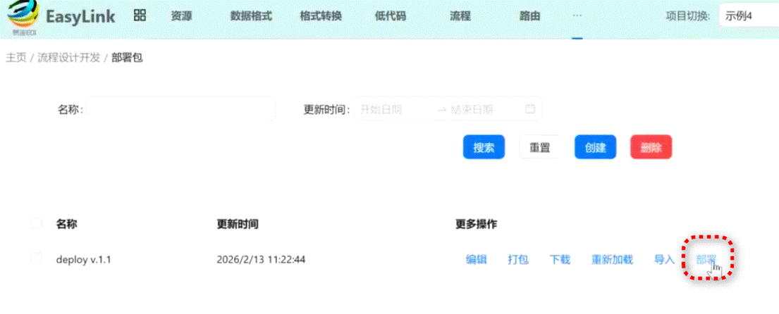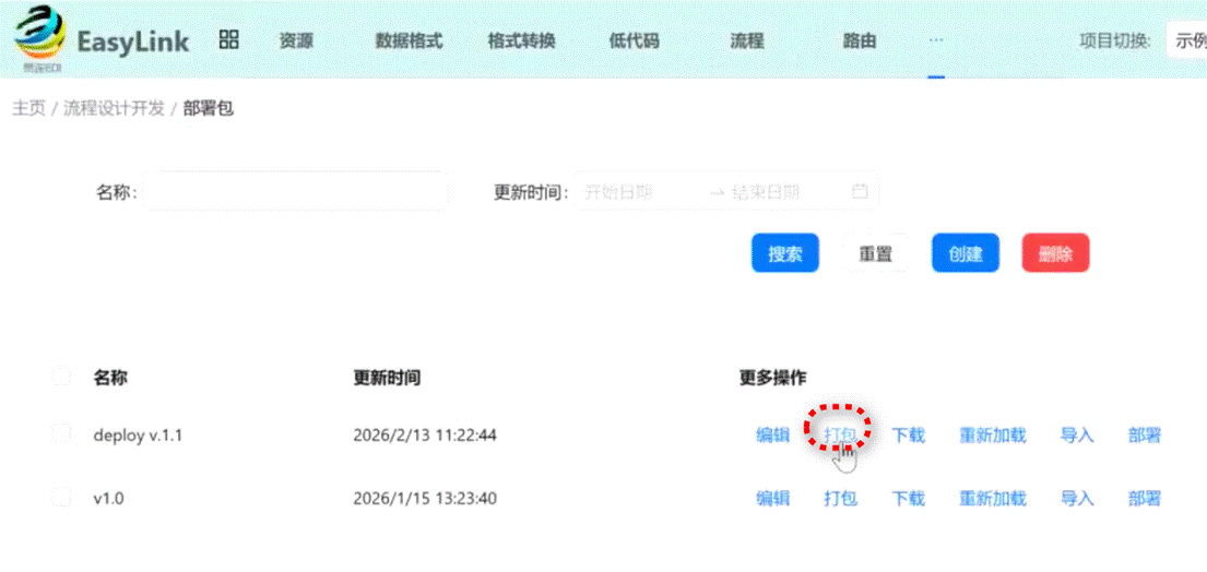 在易连EDI-EasyLink里,项目开发完毕时,可以点击功能菜单“部署包”功能进行一键部署。