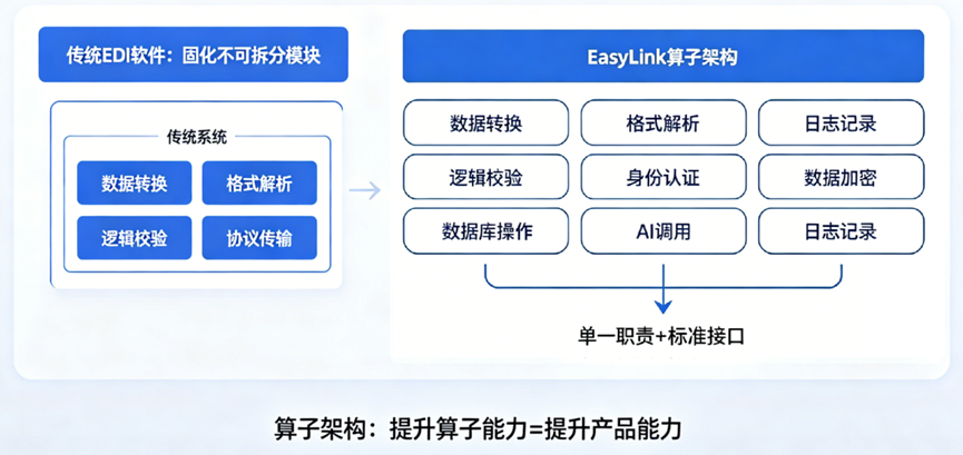 算子架构,是EasyLink的核心灵魂,更是其区别于传统EDI软件的关键所在。不同于传统系统将功能固化为不可拆分的模块,EasyLink创新性地将复杂的EDI全流程核心功能——包括数据转换、格式解析、逻辑校验、协议传输等,拆解为一个个标准化、可复用、独立运行的“算子”单元,每个算子都具备单一职责与标准接口,如同装配式建筑中的标准构件,既实现了功能的精细化拆分,又保障了接口的统一性与兼容性。这种架构设计的核心逻辑,恰如我们所强调的:算子架构只要提升算子能力,就能提升产品能力——算子作为产品能力的最小载体,其每一次优化、每一项升级,都将直接转化为EasyLink的产品竞争力,实现“算子强则产品强”的良性循环。