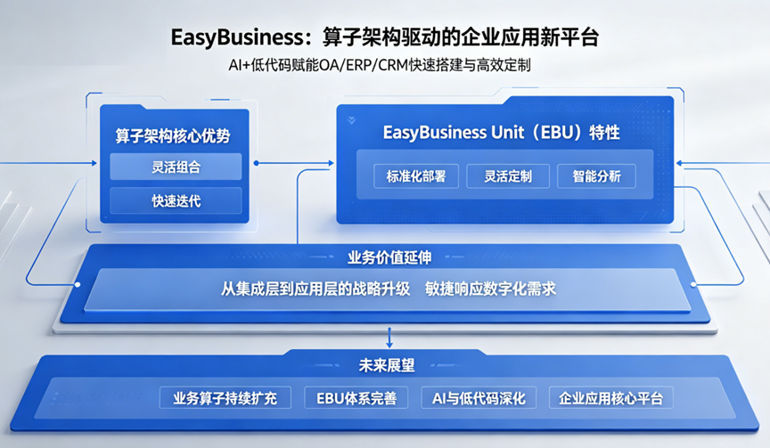EasyBusiness的诞生,是算子架构价值从集成层向应用层的战略延伸,更是对“业务驱动、敏捷响应”数字化需求的深度回应。未来,随着业务算子持续扩充、EBU 体系不断完善,以及 AI 与低代码能力的深化,EasyBusiness 将成为企业实现应用快速构建、灵活演进与智能协同的核心平台,真正践行“算子赋能产品,产品服务业务”的愿景——其潜力,值得每一位企业管理者期待。