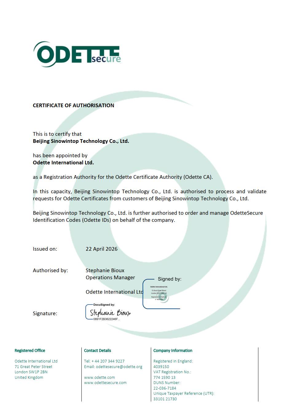 2026年4月22日,Odette International Ltd.为北京聚信万通科技有限公司(Beijing Sinowintop Technology Co., Ltd.)颁发官方授权书,官宣其成为OdetteID及数字证书注册审批管理机构(Registration Authority),可面向客户开展Odette证书受理、审核、颁发及OdetteSecure Identification Codes(Odette IDs)申请与管理服务,为全球汽车供应链安全通信提供权威合规支撑。